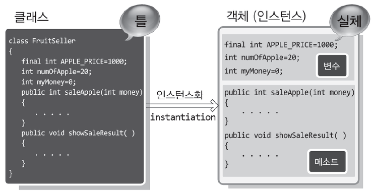 객체들은 실제 그 모습이지만, 클래스는 객체들이 어떤 특징들이 있어야 한다고 정의하는 추상화된 개념이다.