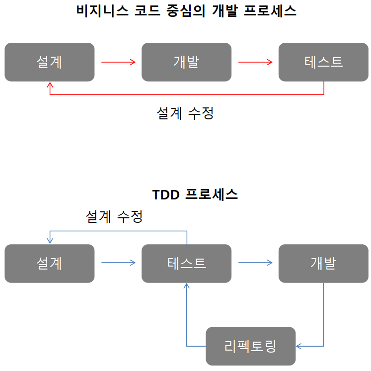 즉, 비지니스 코드를 먼저 작성하는 것이 아닌 테스트가 중심이 되어 전체 개발 방향을 이끌고 나가는 것이다.